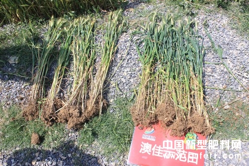 在觀摩會現場,我們看到100畝示范田里的小麥綠油油迎風飄揚,經過農業專家的現場測算,使用澳佳烏金囊后,小麥畝穗數有44萬,但是施用普通復合肥的對照田畝穗數居然達到了51萬。盡管如此,示范田的小麥莖稈粗壯,麥穗子粒飽滿,穗粒數近50,但是對照田穗粒數僅有35。而且,對照田雖然分蘗較多,但是莖稈纖細,呈淺黃色,類似無效分蘗的小穗比較多,后期抗倒伏能力較弱,產量有限;而示范田里小麥長勢十分健康,抗倒伏能力強,后期灌漿將會使得產量大增,預計畝產量達1400斤,增產20%。